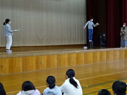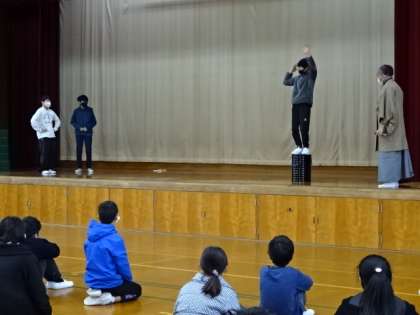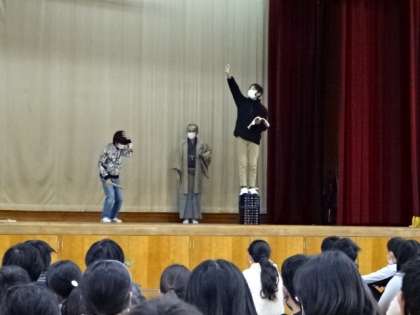 先日の狂言教室を受けて,「柿山伏」の一場面を実際に演じ,狂言師の先生に見ていただきました。緊張しながらも舞台の上で,練習してきた成果を発表しました。