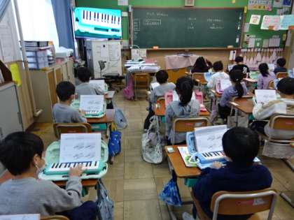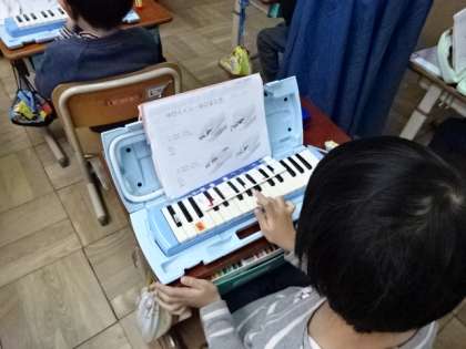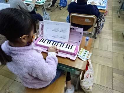 鍵盤ハーモニカの練習です。今日は指の動かし方を先生と一緒に確認しました。