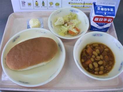 「ポークビーンズ」は1年生も食べなれた献立ですが,本日は「カリフラワー」が初登場でした。「何これ??」「ブロッ…コリー…?」「初めて見た!」など反応はさまざまでしたが,みんなしっかり食べてくれました。