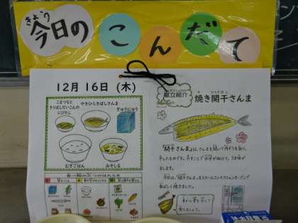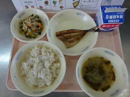 今日の献立は,「麦ごはん・牛乳・焼き開干さんま・小松菜と切干大根の煮びたし・みそ汁」でした。さんまは,骨ごと食べる子もいました。香ばしくてご飯が進みました。