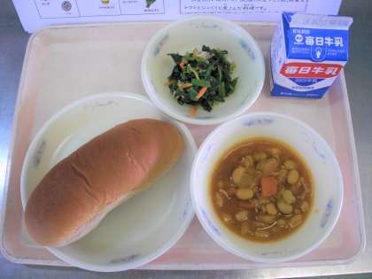 黒糖コッペパン 牛乳 大豆と鶏肉のトマト煮 ほうれん草のソテー です。