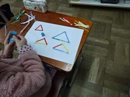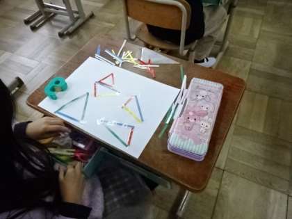 3年生は算数の学習で,三角形の性質について学習していきます。今日は,いろいろな長さの棒を使って実際に三角形を作り,気付いたことを交流しました。