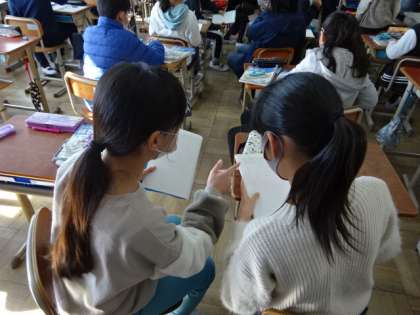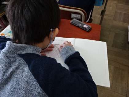 正六角形をかいていきます。分度器やコンパス,定規などを使い,自分で考えた作図の仕方を,みんなで交流しました。