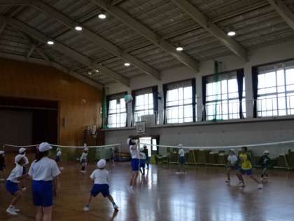 4年生は「ソフトバレーボール」をしています。やわらかい軽いボールを使っていますが,うまくねらったところにレシーブできない様子です。でも,しっかりボールをつないでいこうと,チームで声を掛け合いながら頑張っています。