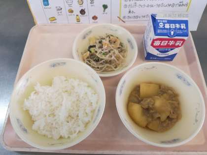 ごはん 牛乳 肉じゃが(カレー味)もやしの煮びたし です。