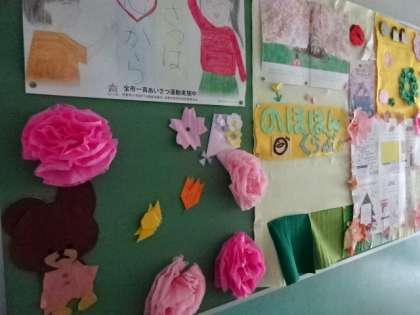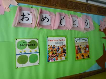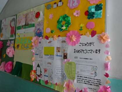 図書館前の掲示板です。入学,そして進級をお祝いした掲示です。図書館は開館準備で中で,今はまだ使えませんが,開館したらぜひ図書館にも行ってほしいです。