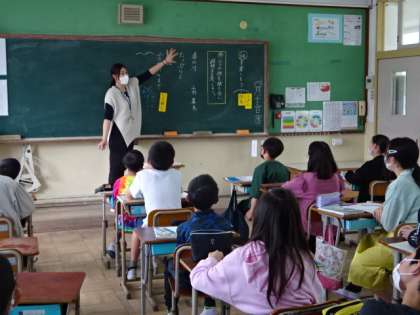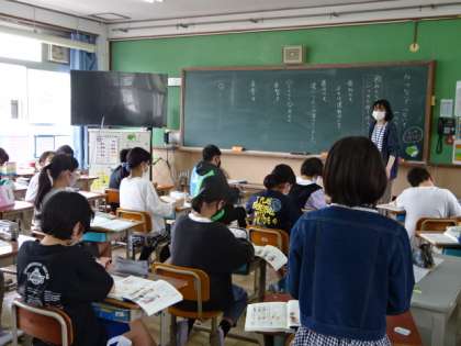 6年生の教室では国語の学習です。学習を進めていく中での約束事を確認しながら,落ち着いた中で,先生とみんなで学習が進んでいます。