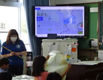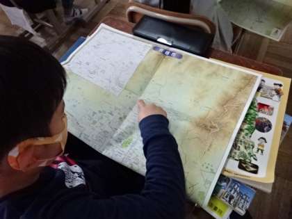 3年生ではいろいろ新しい学習が始まりますが,社会科の学習もその一つ。今日は京都市の地図を広げて,自分たちの住む上賀茂校区の位置を確認したり,東西南北の方角を確認したりしました。
