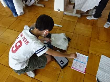 ナップサックを作っています。修学旅行が6月に予定されていますが,その時に持っていくことができたらいいなということで,頑張って作っています。