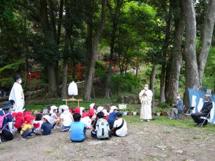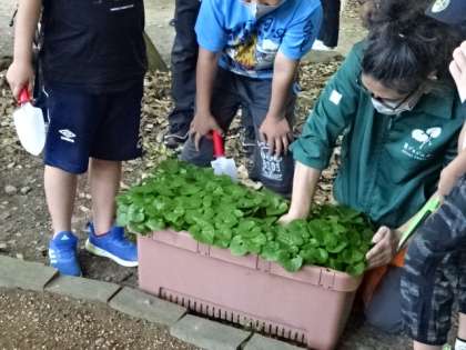 おやじの会の方々が中心となって本校で育てているフタバアオイを,上賀茂神社に届けました。上賀茂神社に自生していたフタバアオイが少なくなってきたことを受けて,本校でも株分けされたフタバアオイを育てて毎年奉納しています。奉納式と共に,上賀茂神社の敷地内に植え替える作業もさせていただきました。