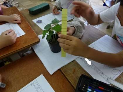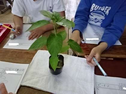 2年生はトマト以外にもいろいろな野菜を育てていきます。ピーマン・オクラ・枝豆などの苗をじっくり観察です。これから暑い夏に向かってどのように成長していくのか,継続して観察していきます。