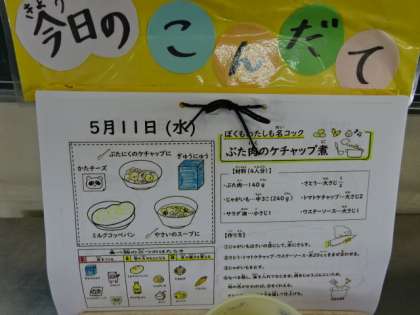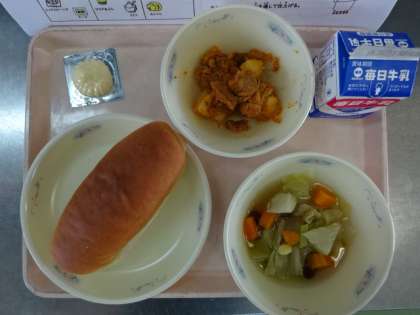 今日の献立は,「ミルクコッペパン・牛乳・豚肉のケチャップ煮・野菜のスープ煮・チーズ」でした。野菜のスープ煮は,スープに野菜のうま味が溶けだし,キャベツの芯まで美味しくいただくことができました。