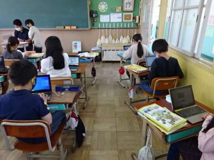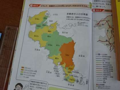 京都府の様子について学習しています。京都市以外の市町村がありますが,それぞれの市町村の様子をタブレット端末を使って調べてまとめていきました。