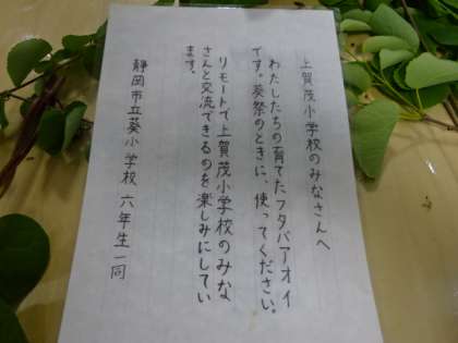今回の奉製には,静岡市立葵小学校で育てられたフタバアオイが届けられ,使わせていただきました。葵小学校と本校とは,長年,フタバアオイを通して交流をしています。ここ数年はオンラインでの交流会を進めていて,今年も交流を予定しています。葵小学校の6年生の皆さんからのメッセージを受けて,本校の児童も思いを込めて奉製させていただきました。今後予定している交流会では,この奉製体験の様子も葵小学校の皆さんにお伝えできたらと思います。