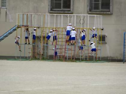 総合遊具や鉄棒を使っての学習が続いています。どちらも手でしっかりと握って遊ぶことが大切になっていきます。安全面も十分に確認しながら学習を進めています。