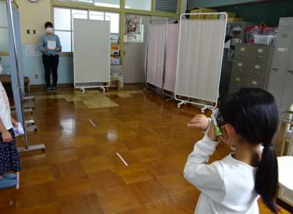 今日は2年生の視力検査の日でした。保健室の先生に測定してもらいました。