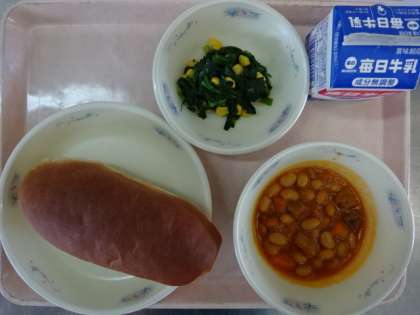 今日の献立は,「黒糖コッペパン・牛乳・ポークビーンズ・ほうれん草のソテー」でした。ポークビーンズは,豚の角切もたくさん入っていて,食べ応えがありました。今日も美味しくいただきました。