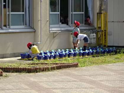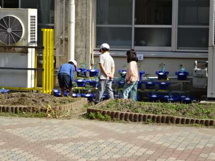 1・2年生は,朝登校してきたら水やりをすることが,日課の一つになっています。自分の植木鉢で育てているので,成長を楽しみに水やりをしています。1年生はアサガオの芽が出てきているのを発見して,嬉しそうに教えてくれました。