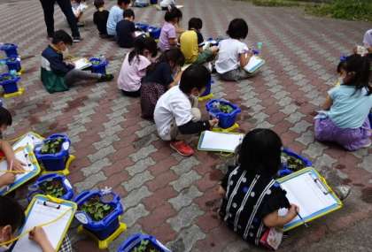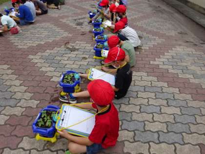 アサガオの観察です。種をまいてから数日。大きな葉が見えてきました。順調に育っていることに,素直に喜ぶ1年生。じっくりと観察記録を書いていました。