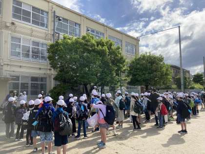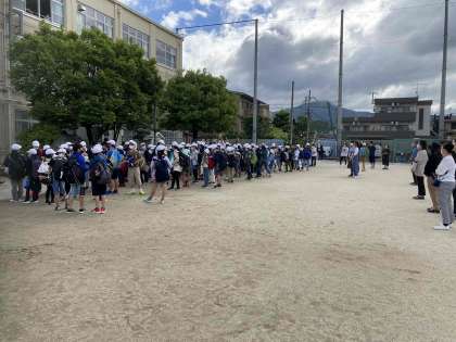 今日から一泊二日の修学旅行です。この日を楽しみにしていた六年生。出発式で、この二日間の修学旅行をみんなで楽しむことを確認しました。