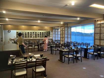 夕食の準備が整ってきました。食事係も座席を確かめてくれています。この後、いい景色を眺めながら、味わっていただきます。