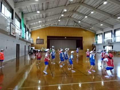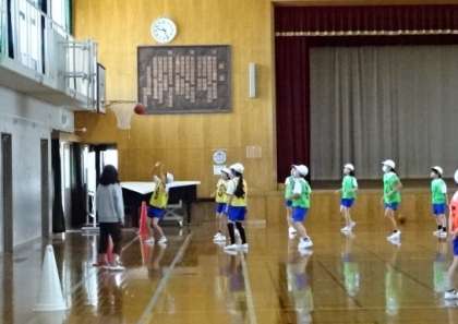 バスケットボールの学習です。チームでお互いに声をかけ合いながら,パスをつないでシュートを目指しています。