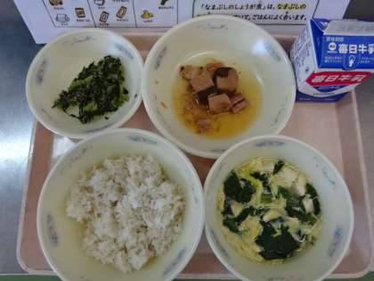 今日の献立は,「麦ごはん・牛乳・なま節のしょうが煮・だいこん葉のごまいため・かきたま汁」でした。なま節は味付けが絶妙で,ごはんと一緒に美味しくいただきました。