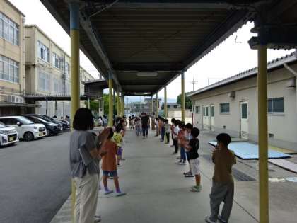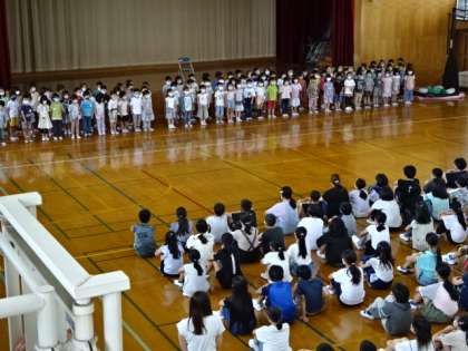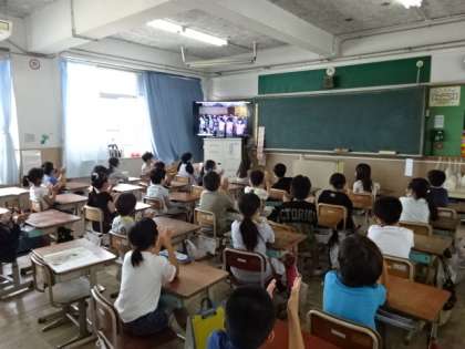 上級生の花道を通って体育館に移動した1年生。体育館にいる6年生,そして,オンラインでつながった教室にいる2〜5年生に向けて,お礼の言葉と歌を発表しました。1年生らしい発表に,みんなからあたたかな拍手がおくられました。これからも,全校みんなで1年生を優しく見守っていきたいです。