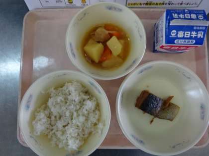 今日の献立は,「麦ごはん・牛乳・さばのかわり煮・鶏肉と野菜の煮つけ」でした。魚にはしっかりと味がしみ,ご飯によく合います。骨も上手に取りながら,美味しくいただきました。
