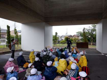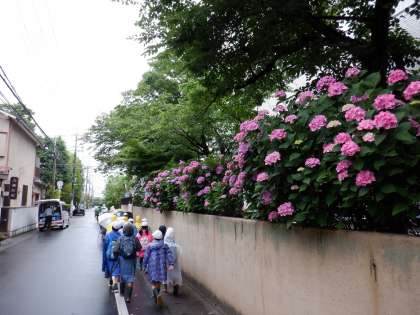 松ヶ崎にある浄水場まで社会見学に出かけました。時折雨が降る中でしたが,歩いて浄水場まで行きました。