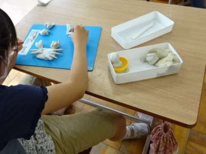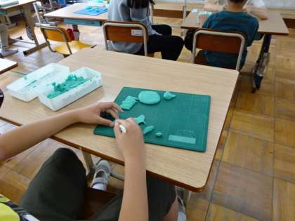 今日は,「先生と同じ形を作ろう」というめあてで,粘土での工作を楽しみました。先生が作るいろいろな形の大きさや長さ,太さを見ながら,各自で粘土を使って形作りをしていきます。最後にはカニが完成し,みんな大喜びでした。