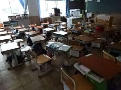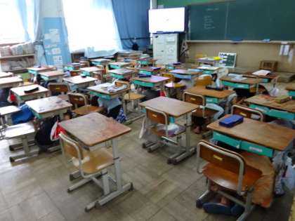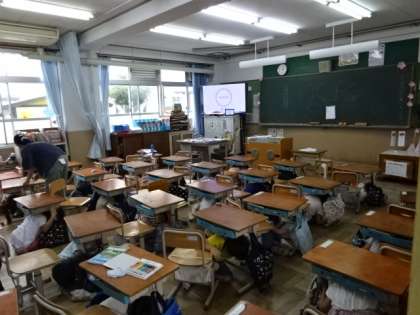 大きな地震が発生したという想定で引き渡し訓練を実施しました。まずは,教室での避難の仕方を確認です。1年生も担任の先生の指示のもと,机の下に身を隠していました。