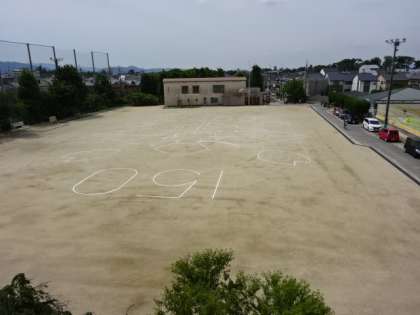 明日28日(火)に,創立150周年記念事業の一環で,全校,そして上賀茂幼稚園と上賀茂こども園の園児たちとで,航空写真撮影を行います。今日はその準備で,朝から運動場に下絵を描いていました。明日はこの線上にみんなが並んで撮影します。