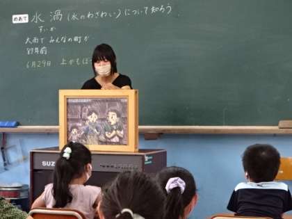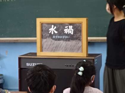 2年生は,「水禍」という紙芝居を担任の先生に読み聞かせてもらいました。このお話は,当時の水害の様子を上賀茂小学校の子たちが作文に書いたことをもとに作られたものです。紙芝居を通して災害の恐ろしさを知るとともに,いざという時にどのように行動すればいいのかみんなで考えました。
