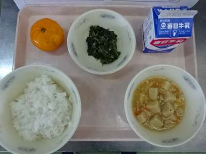 今日の献立は、「ごはん・牛乳・高野どうふのそぼろ煮・ほうれん草とじゃこのいためもの・みかん」でした。高野どうふにおだしがよくしみ、美味しくいただきました。冷たいみかんも今日のような暑い日にはぴったりでした。