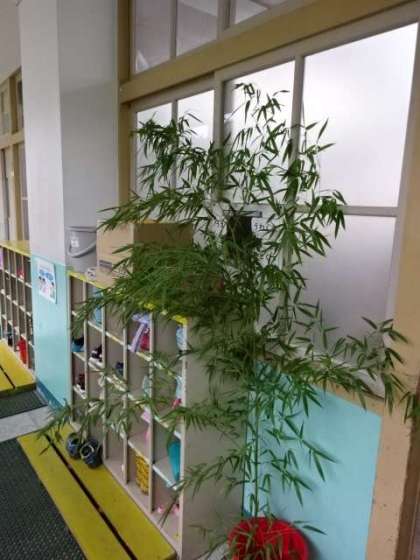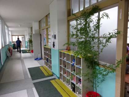 地域の方が1組と1・2年生のために笹を持って来てくださいました。1年生の教室前には、早速に笹が据え付けられました。みんなどんな願い事を書くのかな。