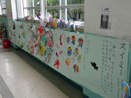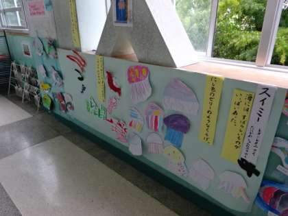 2年生の教室前の廊下には、スイミーの世界が掲示されています。みんな楽しくスイミーの学習を進めてきたことが分かります。