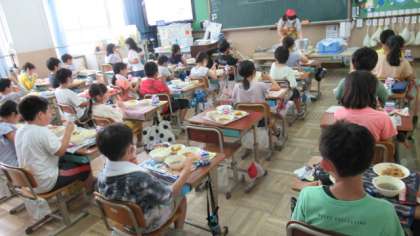 今日は3年4組さんにお邪魔しましたが,みんなお腹が空いていたのかモリモリ食べてくれ,食缶はすぐに空っぽでした。