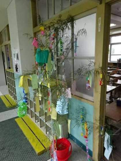 1年生の教室前に飾られた笹に、思い思いにみんなが願い事を書いた短冊が笹飾りと共に吊り下げられています。みんなの願い事がかなうといいですね。