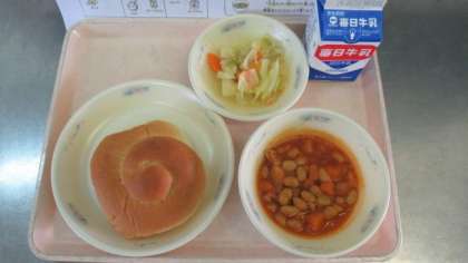 バターうずまきパン 牛乳 大豆と鶏肉のトマト煮 野菜のホットマリネ です。