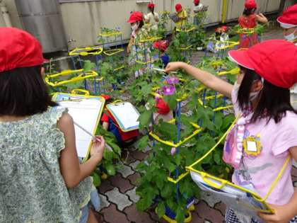 アサガオが咲き始めています。葉も大きくなっていて、自分の手のひらと合わせながら、大きくなったことを教えてくれる1年生。家でも花を咲かせていることを、嬉しそうに教えてくれました。