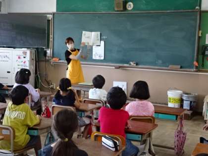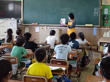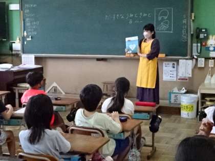 今日は3・4年生の教室で朝の読み聞かせをしていただきました。夏らしく、海の日にちなんだお話がありました。