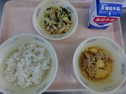 今日の献立は、「麦ごはん・牛乳・肉じゃが(ピリカラみそ味)・小松菜と切干大根の煮びたし」でした。肉じゃがは、じゃがいもがホクホクして美味しかったです。少し辛い味付けも、ごはんがよくすすみました。