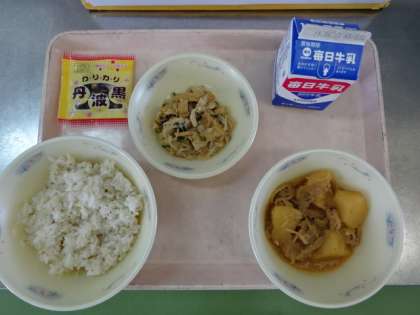今日の献立は、麦ごはん・牛乳・肉じゃが(ピリカラみそ味)・切干大根の煮つけ・黒大豆」でした。ピリカラの味付けは食欲をそそります。今日も美味しくいただきました。