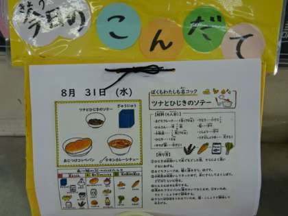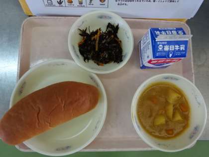 今日の献立は、「味つけコッペパン・牛乳・チキンカレーシチュー・ツナとひじきのソテー」でした。カレーシチューはパンにもよく合い、パンと一緒に食べるとナンみたいで美味しいと、子どもたちも喜んでいました。