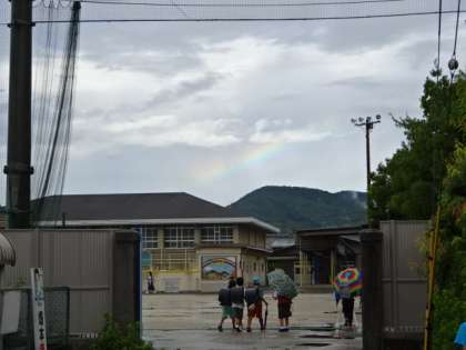 朝、激しく降っていたのがやんで、西の空に虹が出ていました。東門から登校してくる子たちが気付いて、「虹が出てるよ。」と教えてくれました。思わずふり返り、写真を撮っていました。