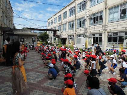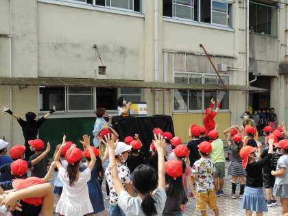 月に1度のお楽しみ、「のほほんあおぞらおはなしかい」が7日(水)の中間休みに中庭で行われました。今日は「からだをうごかすえほん」というお話で、みんなで体を動かしながら楽しんでお話を聞きました。特別ゲストの赤忍者・黒忍者も駆けつけてくれて一緒にジャンプをしたり手裏剣を投げる動作をしたりしました。子ども達は大喜びで体を動かしていました。来月はどんなお話が聞けるのか楽しみですね。