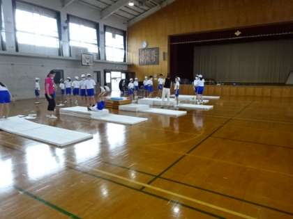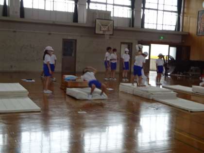 マット運動に取り組んでいます。技ができるようになるために、友だちと関わり合いながら学習を進めています。