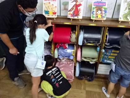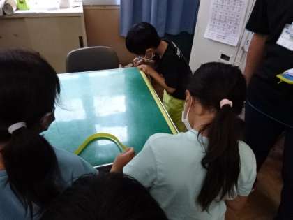 「おおきさくらべ(1)」の学習です。先生の大きな机を教室の入り口の扉から外に出すことができるかをみんなで調べました。長いテープを使って、長さを測りながらみんなで考えました。授業の最後には、高さくらべもしました。