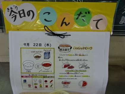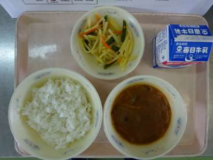 今日の献立は、「ごはん・牛乳・ハッシュドビーフ・じゃがいものソテー」でした。今日は子どもたちにとって大人気メニューです。おかわりもたくさんして、今日も美味しくいただきました。